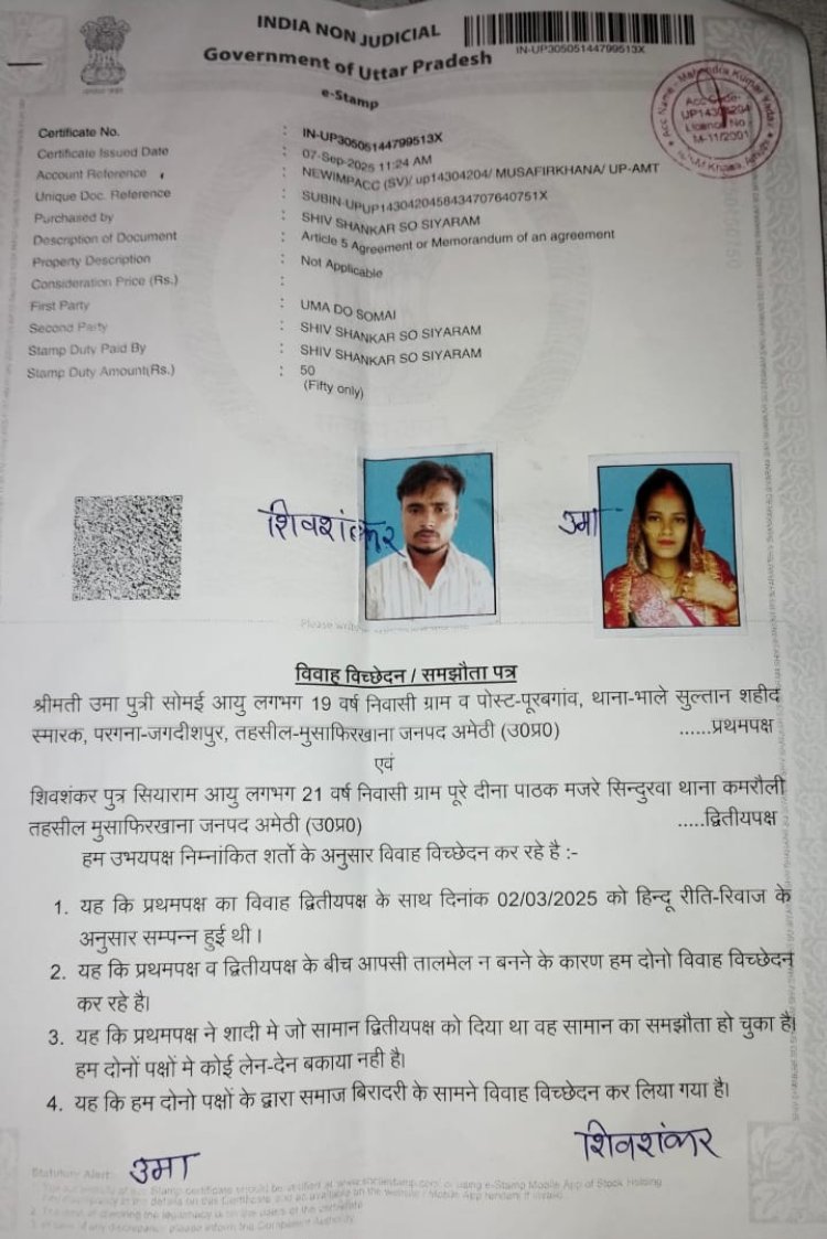 अमेठी, 14 सितम्बर । जनपद के कमरौली थाना क्षेत्र के दीना पाठक का पुरवा मजरे सिंदूरवा गाँव में पति द्वारा पत्नी की प्रेमी से शादी कराने का मामला अब नए विवादों में घिर गया है। पीड़िता उमा और कथित प्रेमी विशाल प्रजापति ने पुलिस व गाँव के प्रधान सहित ससुराल पक्ष पर गम्भीर आरोप लगाए हैं। वहीं पुलिस ने इन आरोपों को पूरी तरह निराधार बताया है।