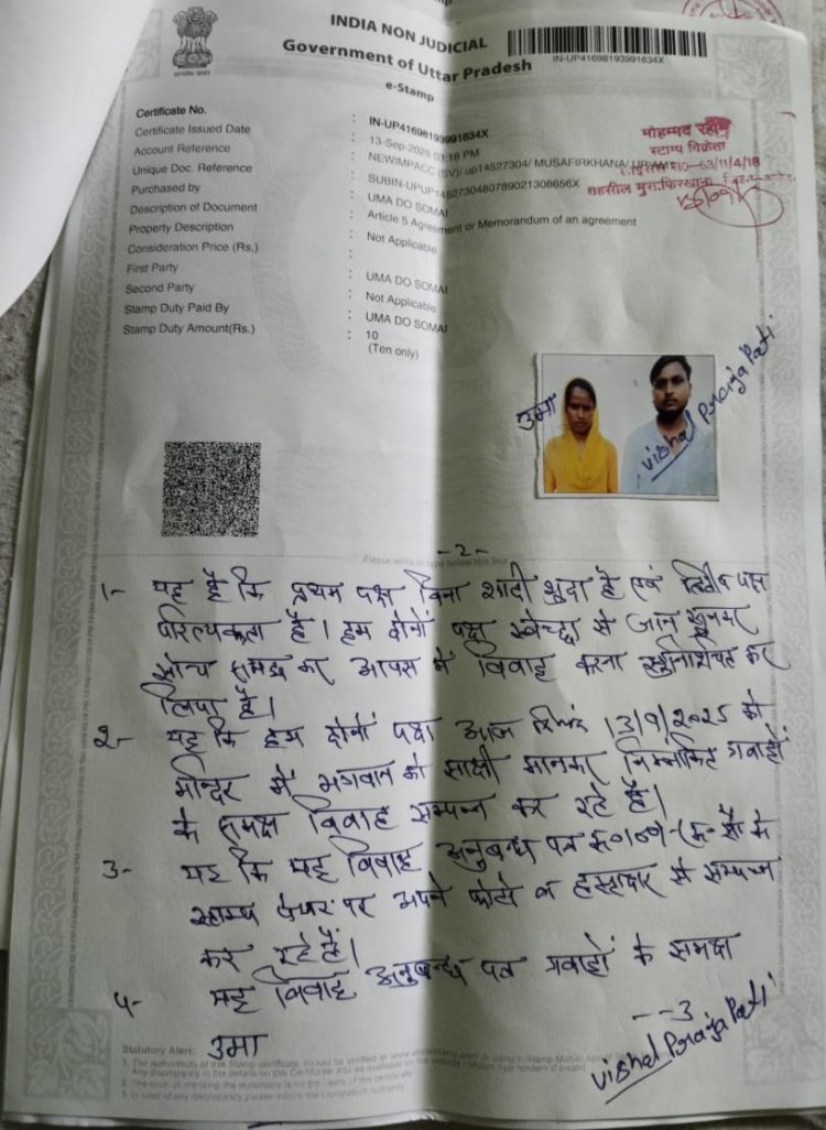 कमरौली थानाध्यक्ष मुकेश पटेल ने रविवार की शाम को आरोपों को निराधार बताते हुए कहा कि मामला 4 सितम्बर को उनके पास आया था। पति-पत्नी दोनों का शांति भंग की धारा में चालान किया गया। बाद में दोनों परिवारों की सहमति से उमा और शिवशंकर ने स्टाम्प पेपर पर विवाह विच्छेद का हलफनामा जमा किया, जिसके बाद उमा और विशाल ने 13 सितम्बर को मंदिर में विवाह अनुबंध पत्र प्रस्तुत किया। थानाध्यक्ष ने कहा कि यह पूरा विवाह उनकी जानकारी में आपसी सहमति से हुआ है।
