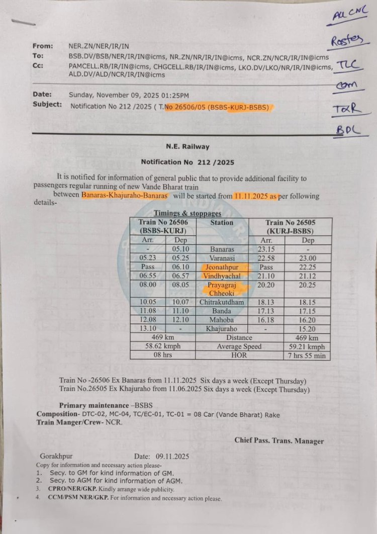 यह आधुनिक सेमी-हाईस्पीड ट्रेन सप्ताह में छह दिन (गुरुवार को छोड़कर) चलेगी और उत्तर प्रदेश व मध्य प्रदेश के प्रमुख धार्मिक, सांस्कृतिक एवं पर्यटन स्थलों को आपस में जोड़ेगी। कल्पना कीजिए, अब आप काशी के पवित्र घाटों से सीधे खजुराहो के अलौकिक मंदिरों तक का सफर कम समय में कर पाएंगे!